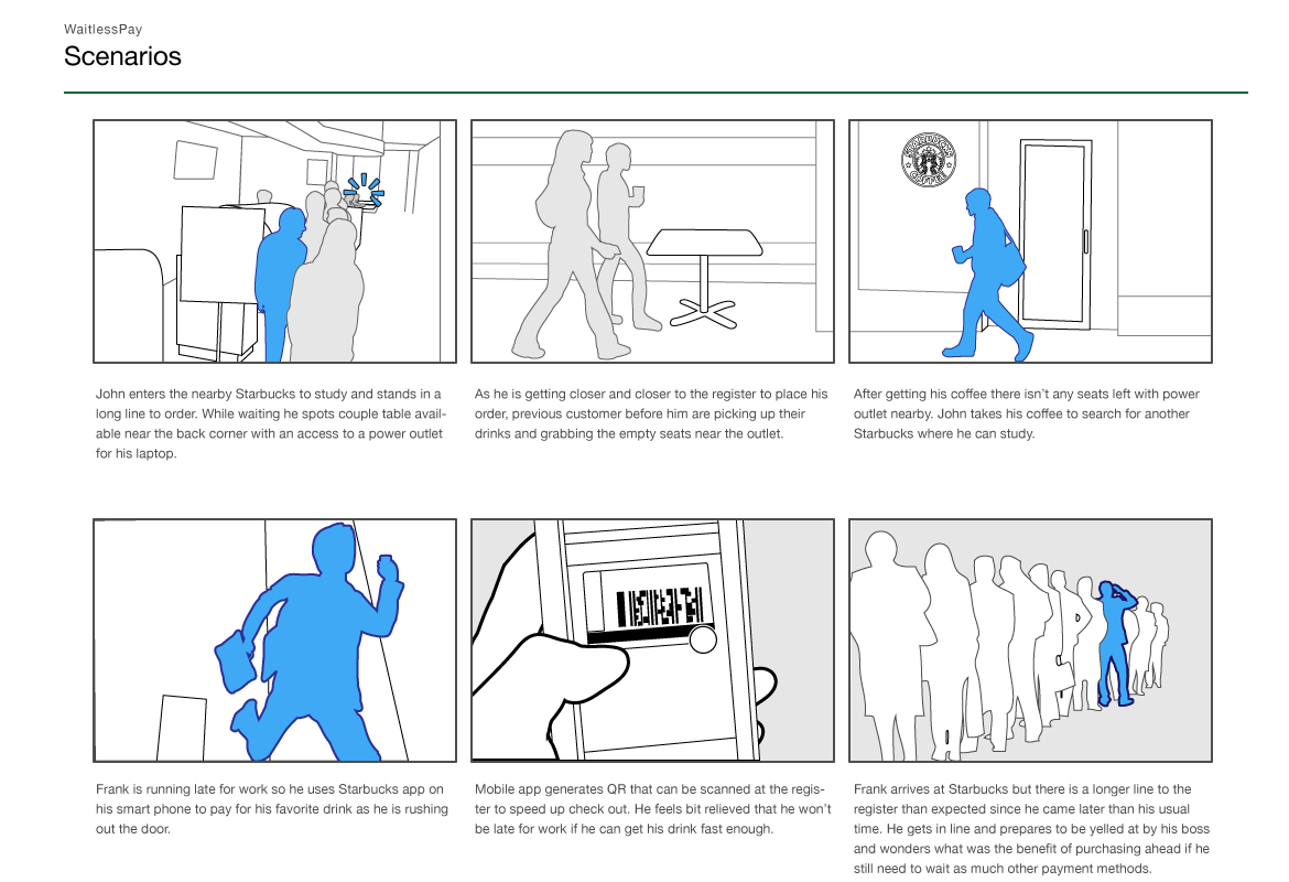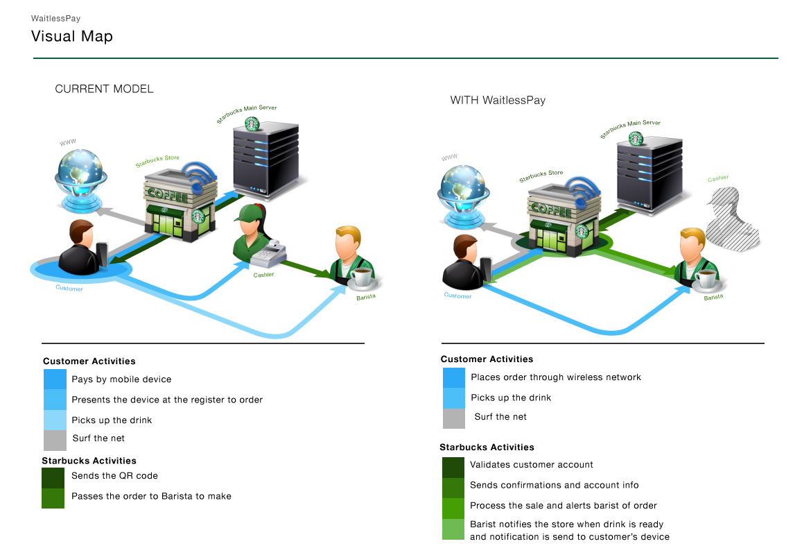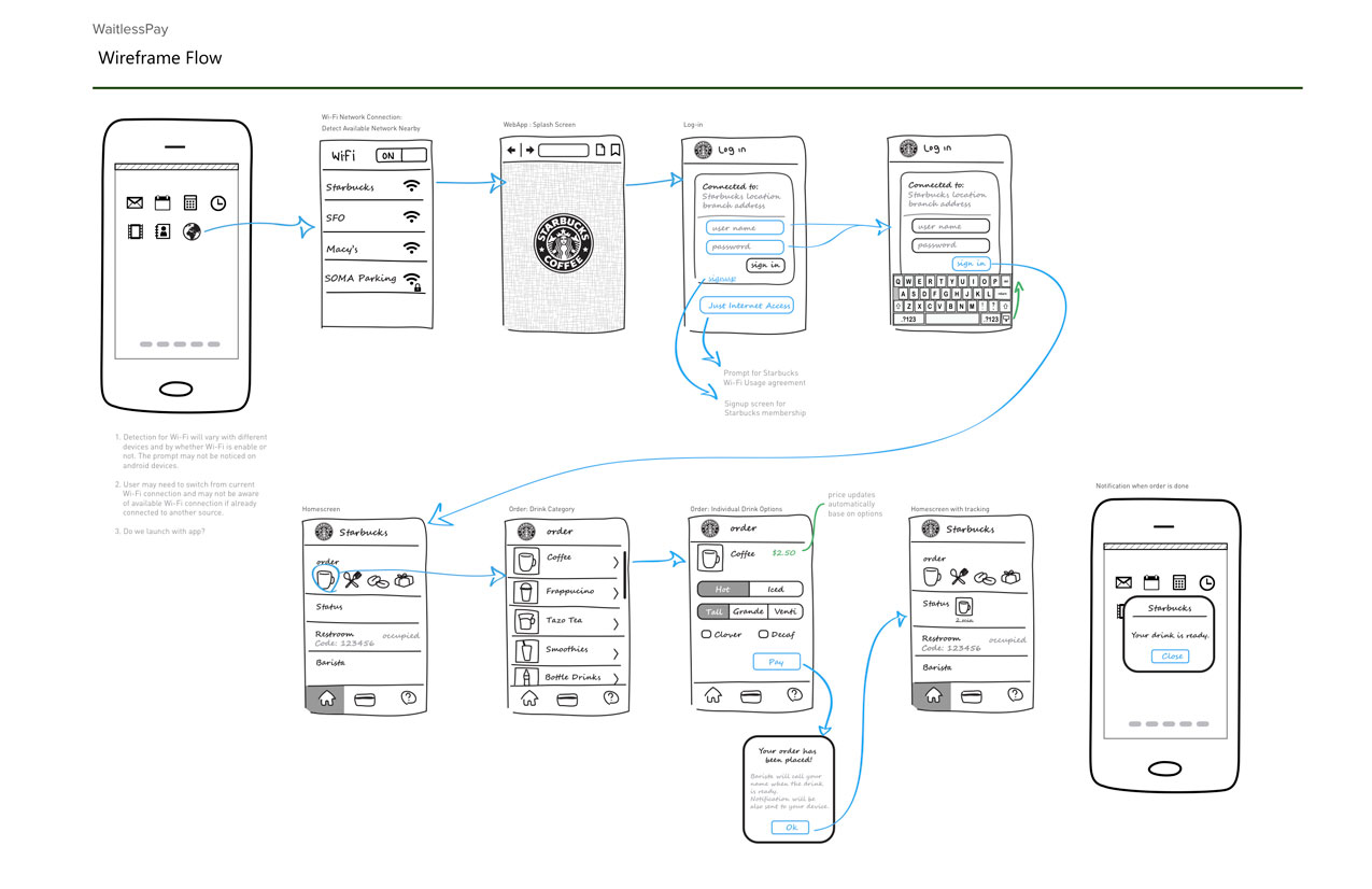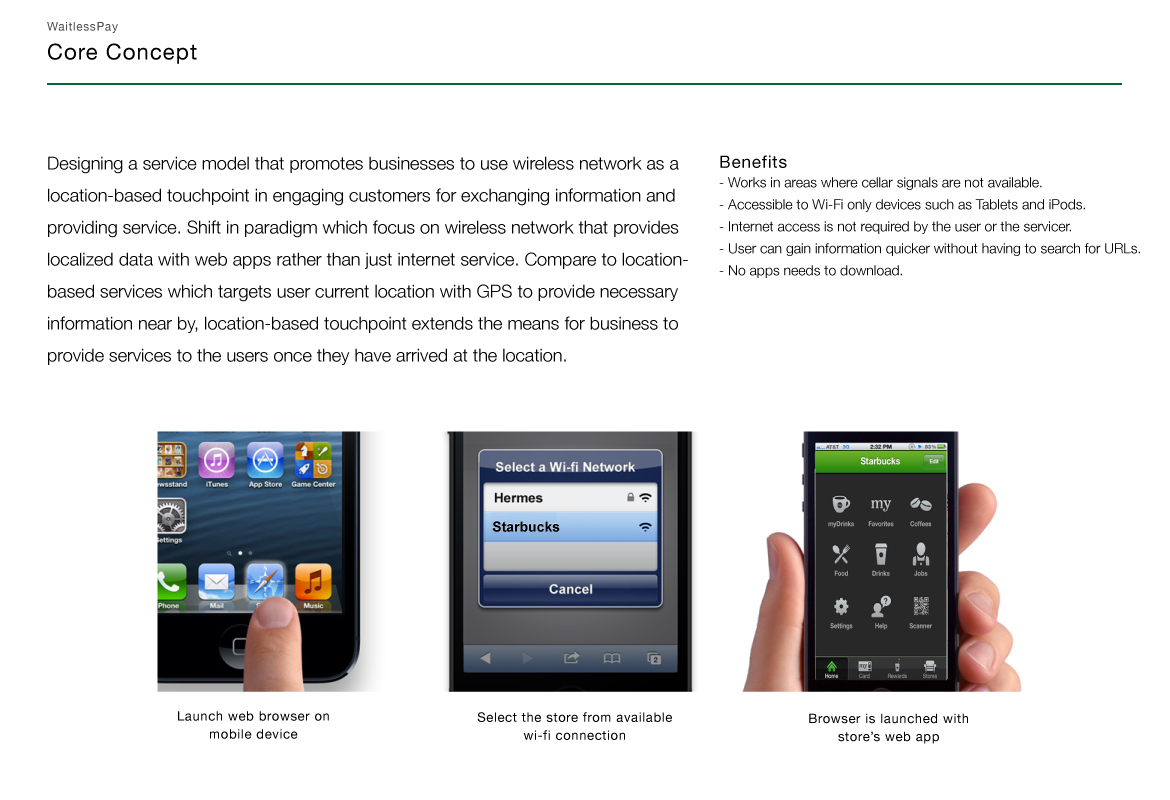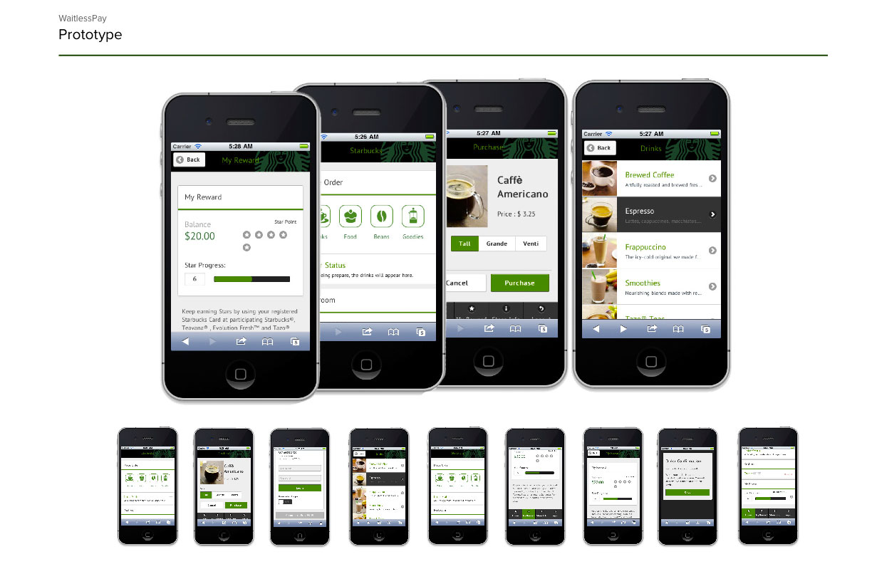WaitlessPay enhances the Starbucks experience by minimizing the wait time spent for purchasing the coffee. Users are able to place the order and pay for the coffee through mobile devices without needing to wait in a long line. Simply connect to Starbucks Wi-Fi with the Starbucks account to place the order, or select the near by Starbucks store for pickup location using the gps on mobile devices. WaitlessPay also alerts the user with notification when the order is ready. Payment for purchases are handled with existing method of payment associated with the Starbucks account.
